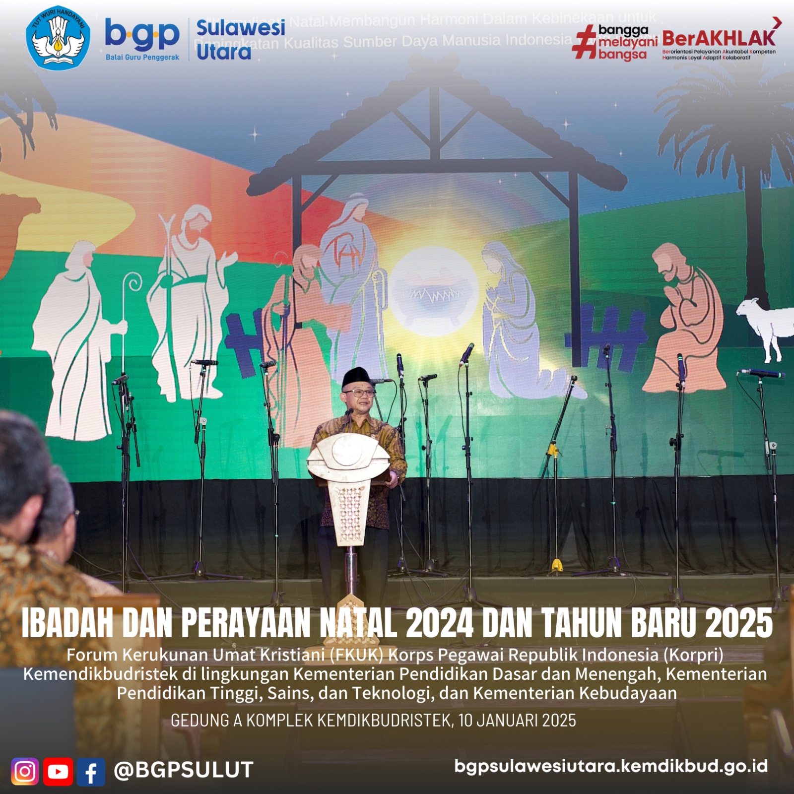 Menteri Pendidikan Dasar dan Menengah (Mendikdasmen), Abdul Mu’ti, menghadiri perayaan Natal 2024 dan Tahun Baru 2025 yang diselenggarakan gabungan oleh tiga kementerian yaitu Kementerian Pendidikan Dasar dan Menengah; Kementerian Pendidikan Tinggi, Sains, dan Teknologi; dan Kementerian Kebudayaan.